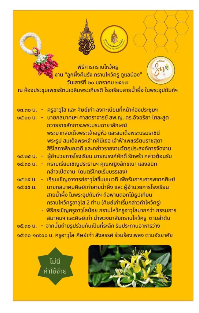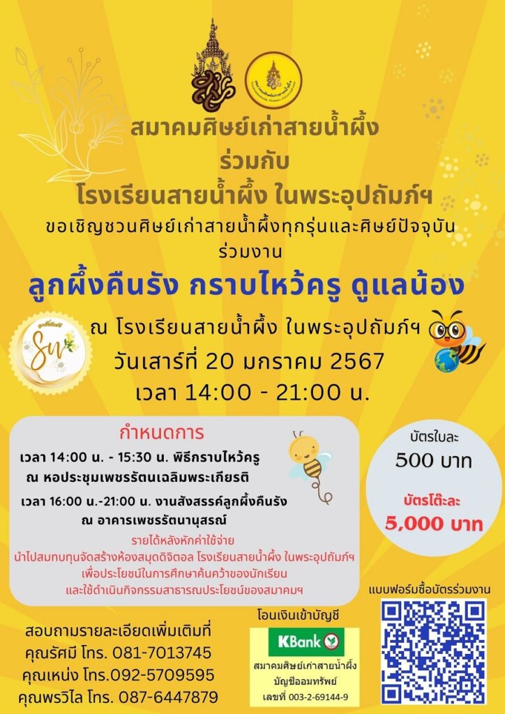 สมาคมศิษย์เก่าสายน้ำผึ้ง ร่วมกับโรงเรียนสายน้ำผึ้ง ในพระอุปถัมภ์ฯ ขอเชิญชวนศิษย์เก่าสายน้ำผึ้งทุกรุ่นและศิษย์ปัจจุบัน ร่วมงาน “ลูกผึ้งคืนรัง กราบไหว้ครู ดูแลน้อง” ในวันเสาร์ที่ 20 มกราคม 2567 เวลา 14:00 – 21:00 น. ณ โรงเรียนสายน้ำผึ้ง ในพระอุปถัมภ์ฯ
